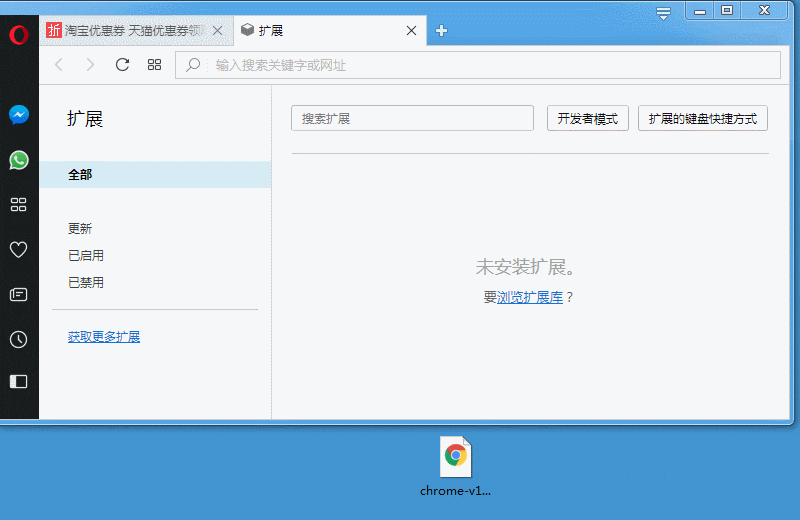 注意:安装Opera浏览器插件需要先打开扩展中心,再把插件拖至浏览器安装: